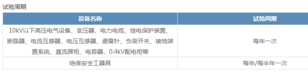 设备名称是10KV以下高低压电气设备,变压器,电力电缆,继电保护装置,断路器,电流互感器,电压互感器,避雷器,负荷开关,接地装置系统,直流屏柜,电力电容器,配电柜等设备。试验周期为每年一次。绝缘安全工器具,试验周期为每半年一次。